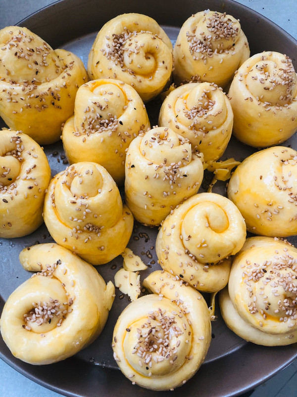 发好后的面包坯表面刷一层蛋液,撒上白芝麻,撒几粒黄油于缝隙增加面包香