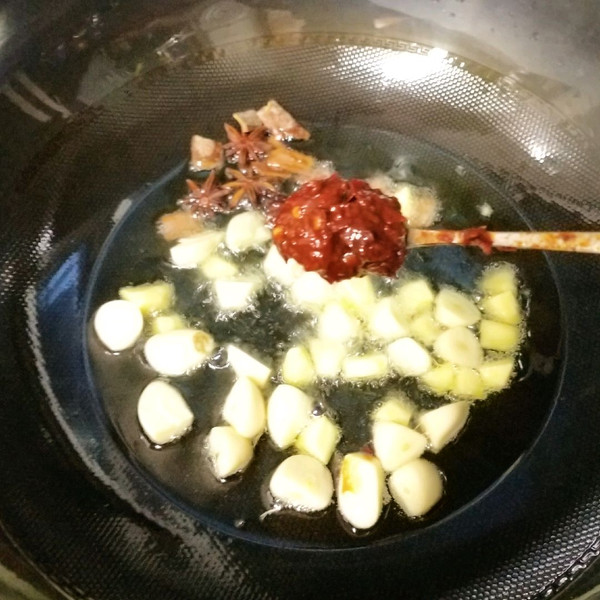 大火热锅倒入冷油,转小火把桂皮、八角、姜蒜放进油锅里爆香。