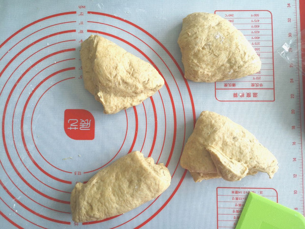 分割面团。我是均分成4份,大家可以根据自己的吐司盒大小分割成3份。