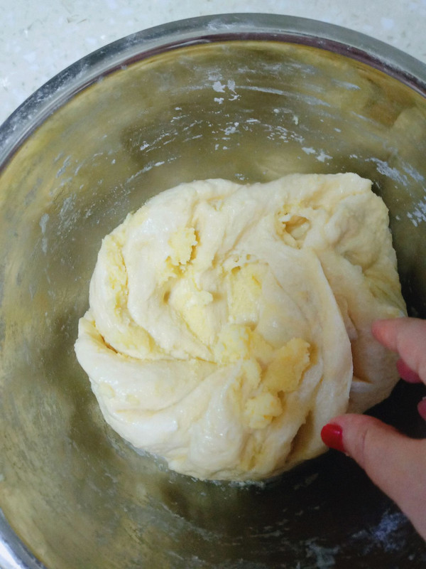 接下来把室温的黄油加入面里揉,直到黄油完全被面吸收,继续揉,揉至出了膜为止(膜就是你用手拉面会出现不会轻易的断掉,像一个胶皮手套的样子,或者不用做到这样也可以,但至少得揉15分钟左右),揉好后让醒发至两倍大