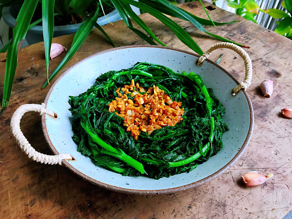 煮好的料汁直接淋在盘中茼蒿上面,做法简单又好吃的茼蒿美食制作完成。