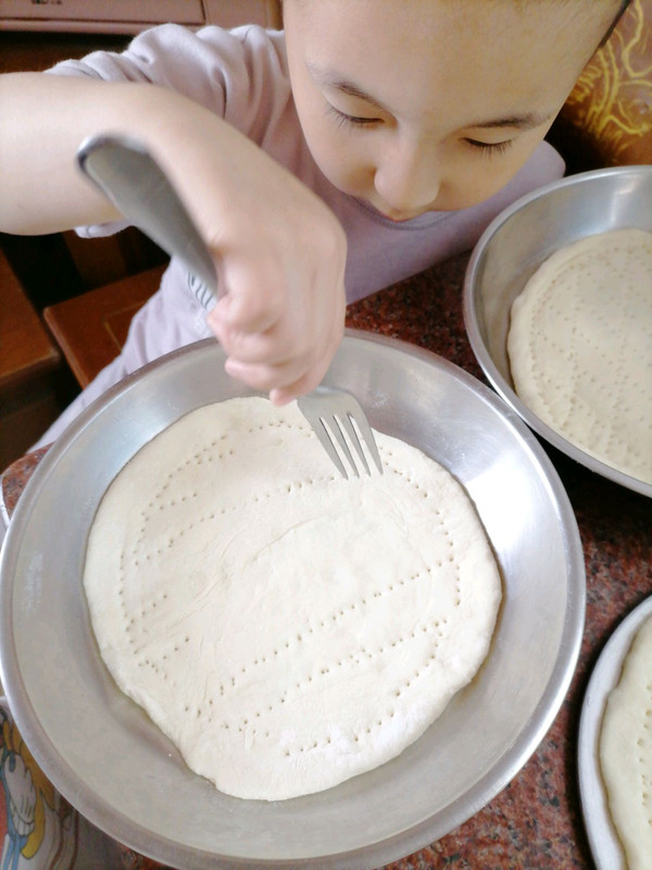 盘刷油,擀开后放披萨盘,没有的用菜盘,扎孔,这样烤出来不会鼓,不需要卷边