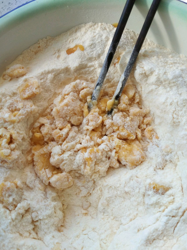 面粉加玉米粉加鸡蛋,鸡蛋打散,