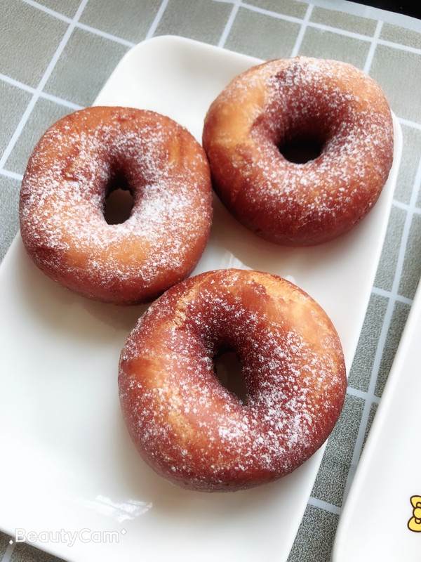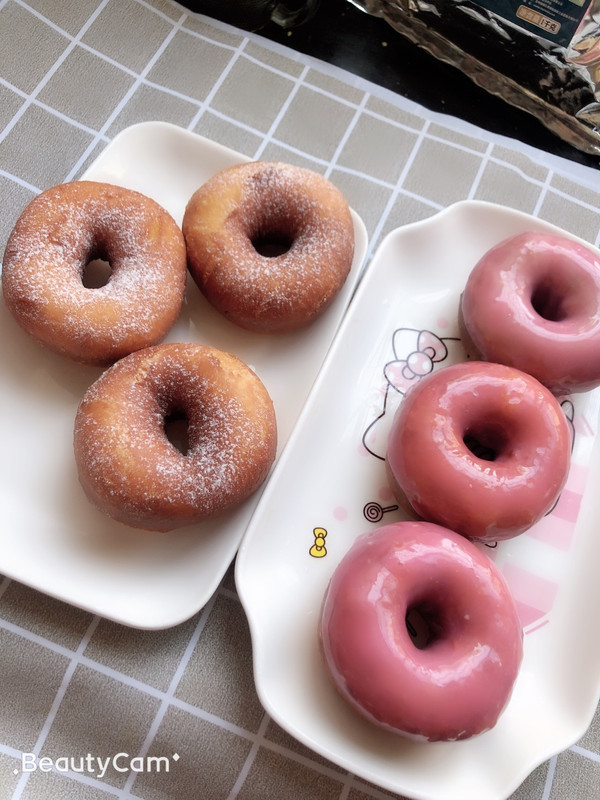 我又做了几个粉色巧克力的甜甜圈,巧克力隔温水融化,把甜甜圈放进去沾上一层巧克力,放在冰箱静置一分钟,让巧克力凝固就好了。