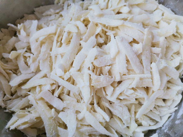 将土豆在上面的工具上擦下来。取适量面粉拌进去,使面粉均匀沾在土豆上。由于土豆品种及新鲜度的影响,使用的面粉质量不定,只要让土豆粘上面粉即可。上图是拌了面粉的土豆。