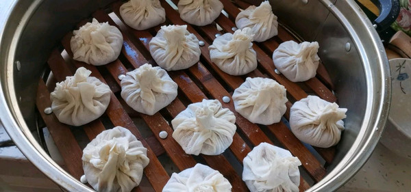 馅儿不要包太多,饼皮边缘沾水,轻轻拢住捏好,放入笼屉(注意留一定空隙)。