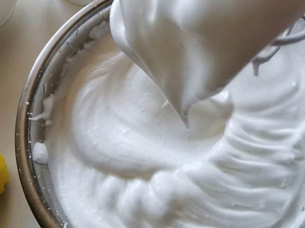 蛋清加入几滴柠檬汁,用电动打蛋器高速打发至起泡,加入三分之一白糖。