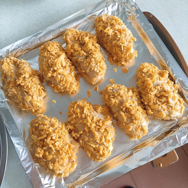 鸡蛋液备用,和大波浪薯片砸碎备用,和面粉,依次把鸡翅放入面粉 鸡蛋液 薯片碎