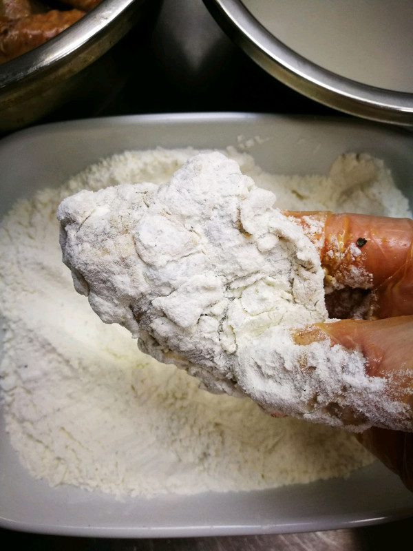 再次沾上裹粉,来回反复按压,让裹粉厚厚的包上鸡翅,再用手捏鸡翅,会压出裂纹,这是后面炸好的鸡翅上鳞片状的来源。