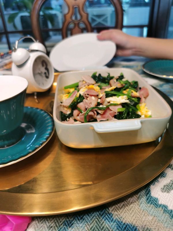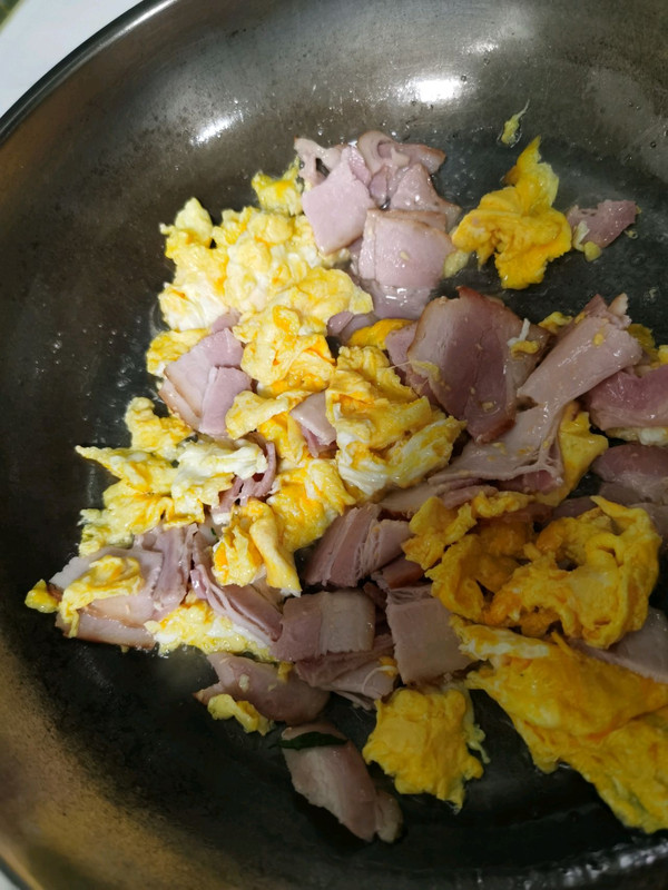 锅内放油,先放入鸡蛋炒成块儿,然后加入培根炒熟