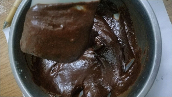 再牛奶油糖混合液里加过筛的低粉可可粉,并用翻拌手法拌匀。不可画圈搅拌,以免面粉起筋。
