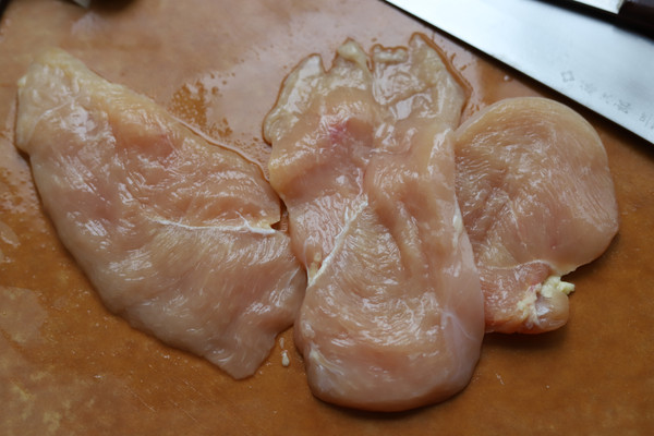 鸡胸肉比较厚,我们把它洗干净,分成三片,切的时候最好用快一点的刀。