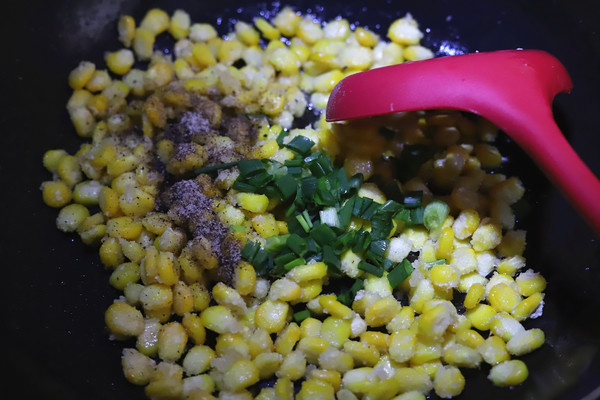 油锅烧热,下入玉米粒中火煎,把外表的淀粉煎脆即可。
