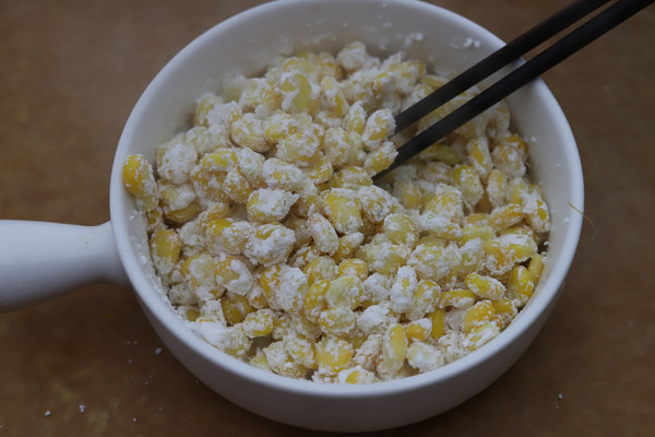 用筷子轻轻搅动,让每一粒玉米上都沾上一层薄薄的玉米淀粉。
