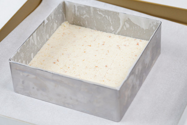 烤盘里垫油纸,放上慕斯圈sn3305/14.5cm,慕斯圈里也要抹黄油黏油纸,然后将饼糊全部倒进去。