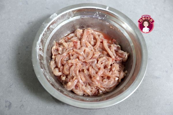 炒锅中倒适量油,大火,油温5、6成热时,将肉丝入锅中,迅速划散;