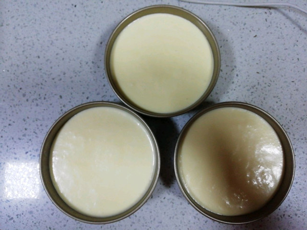 左图是我的黄油被“晒化后”水油分离了,我搁置一夜后凝固的状态 右图是我将凝固后的黄油又重新隔水加热了。 大家可以直接将黄油隔水加热,软化成黄油液即可。