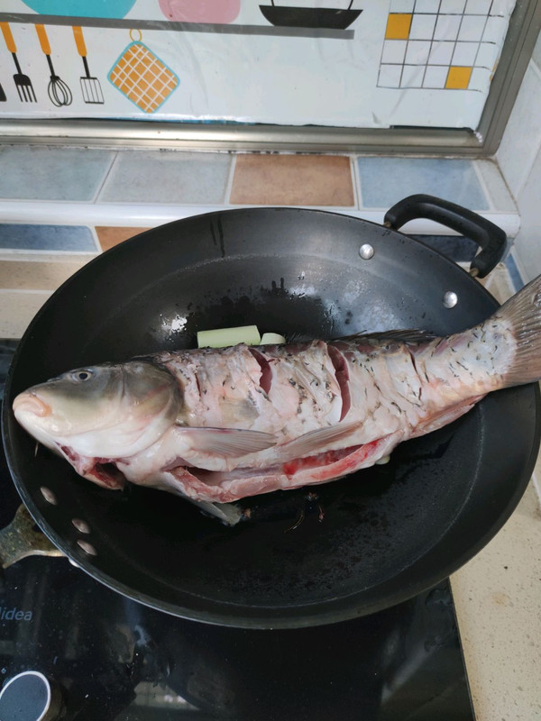 加入鱼,将鱼两面煎一下,注意不要烫到手,不要糊底,鱼微微收缩膨胀即可