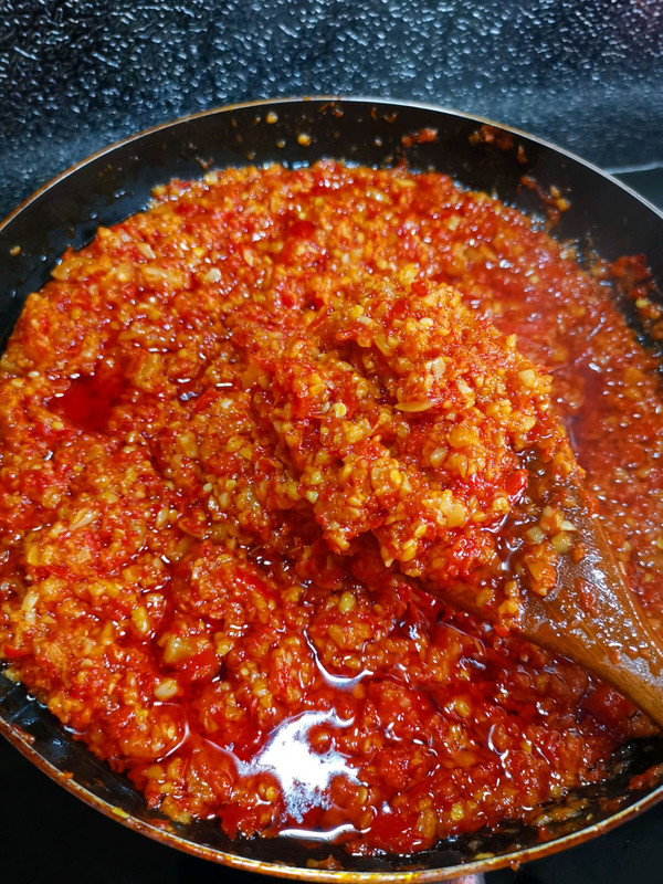 锅内无水倒入500毫升的油烧五层热时放入蒜蓉炒香后,再加入瑶柱和辣椒翻炒均匀