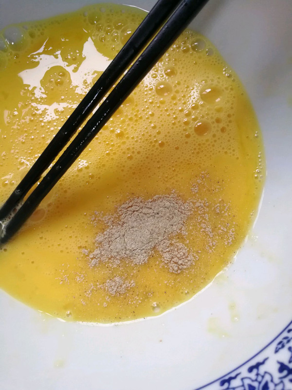 碗里打入6个鸡蛋 放盐 白胡椒 搅拌均匀
