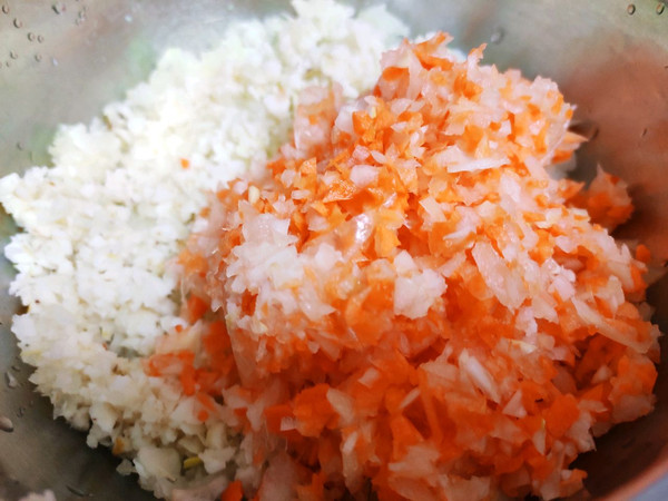 胡萝卜,圆葱打碎成末,倒入荸荠碎加一点油拌匀。