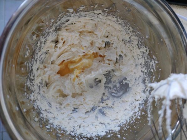 将鸡蛋液分三次加入打发好的黄油中,每次要搅打均匀后再加入下一次