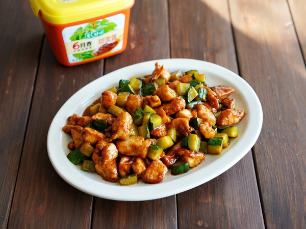 酱都裹满鸡肉后,基本也熟了,倒入黄瓜丁