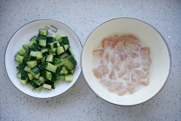 鸡胸切成丁,放入少量的盐,适量的白胡椒粉,1勺料酒,1个蛋清,1勺淀粉,抓匀腌制20分钟。