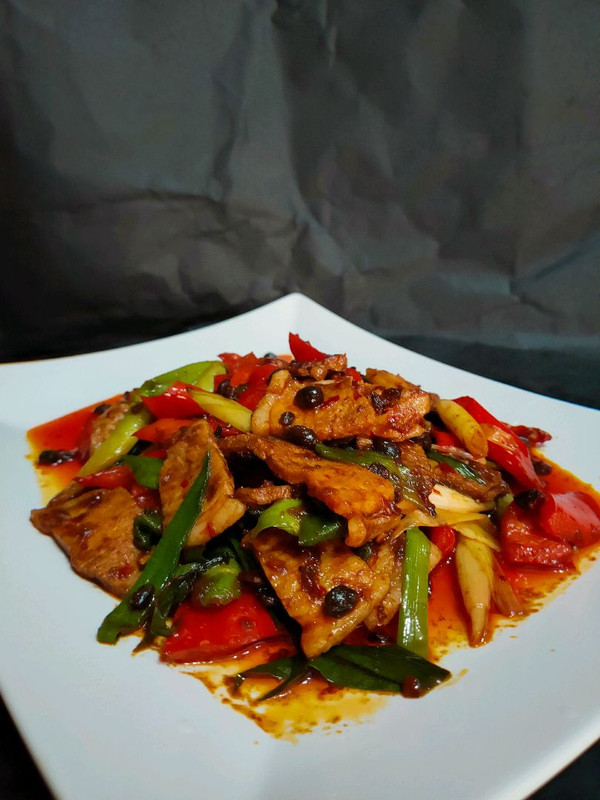 放豆豉炒香,再放入肉片,青蒜翻炒。