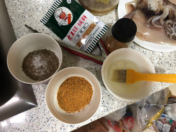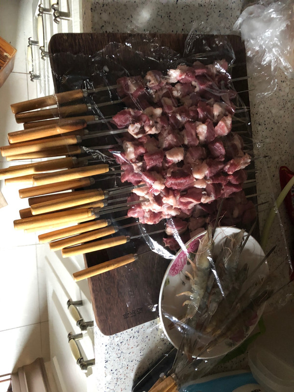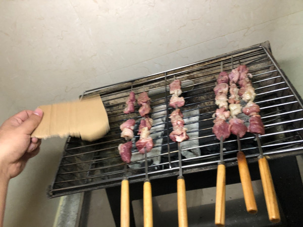 准备的工具及小料,烤第一盘时要刷些油在肉串上,不然容易粘,以后就不用了,肉串自己的油会润滑