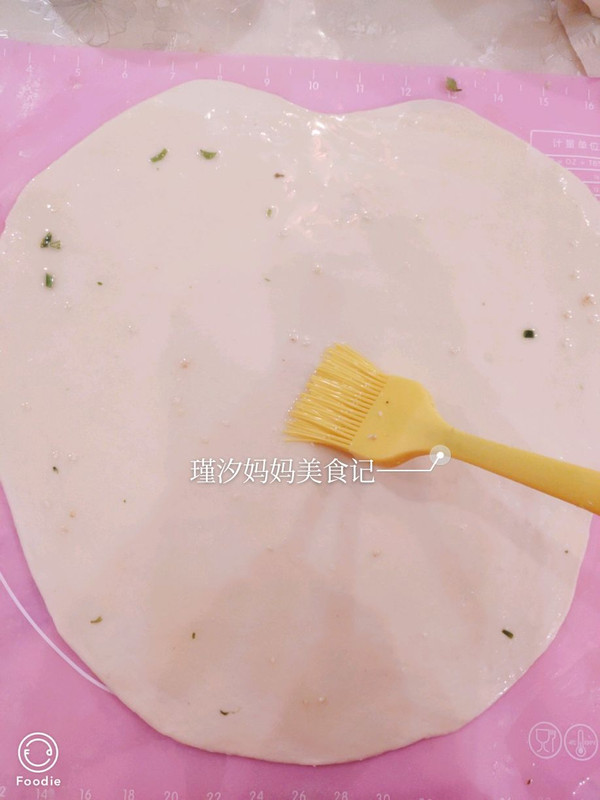 用擀面杖将面团擀成0.5厘米的薄片,厚薄随意即可,用刷子刷上香油,没有刷子将油倒在中心,用手拉起每个角到中心沾上油即可!