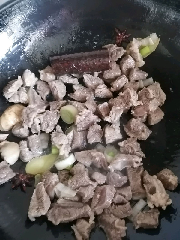 锅烧热,放油,加入葱姜八角爆香,加入牛腩翻炒加入开水烧沸腾后,倒入高压锅