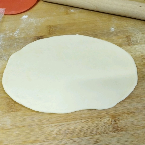取一个面团擀成椭圆形(先上下擀成牛舌状再翻过来擀开就就是这样子)