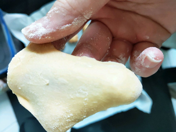 面团擀成圆形每个包入40到45克馅料,整形成不规则的红薯形状