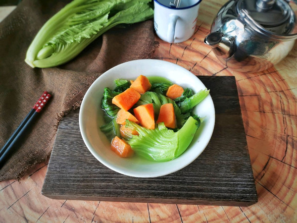 水煮沸后放入芥菜,加入油,盐调料煮至红薯变软即可。