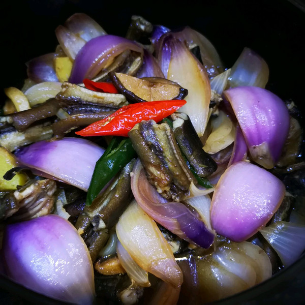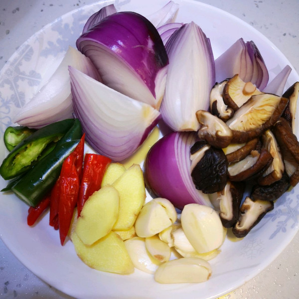 洋葱切大块,辣椒斜切,泡发好的香菇挤干水切块,蒜头拍一下好出味。我的辣椒是自己种的比较小,不吃辣的可以把辣椒子洗掉,我觉得还是有点辣味好吃点