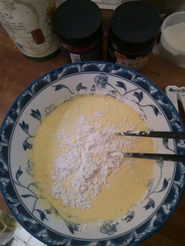 再加入75g的低筋面粉,建议大家筛进奶油蛋液中,这一步我偷懒面粉没过筛,,接过去有很多颗粒,,后来又把面糊过筛一遍才搞定