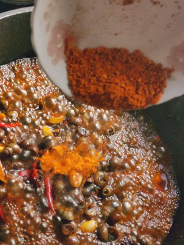 倒入除葱以外的配料翻炒出香味,倒入田螺,放入生抽两勺,老抽两勺,料酒两勺,糖两勺,翻炒两三分钟