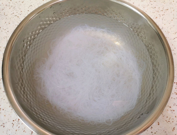 煮好的粉丝从锅里捞出过凉水,然后控一下水分备用。