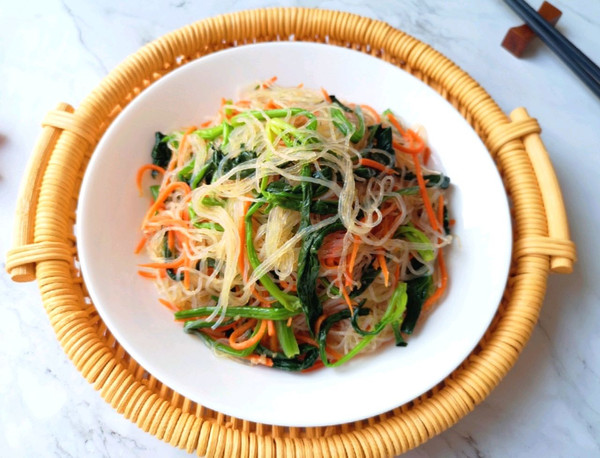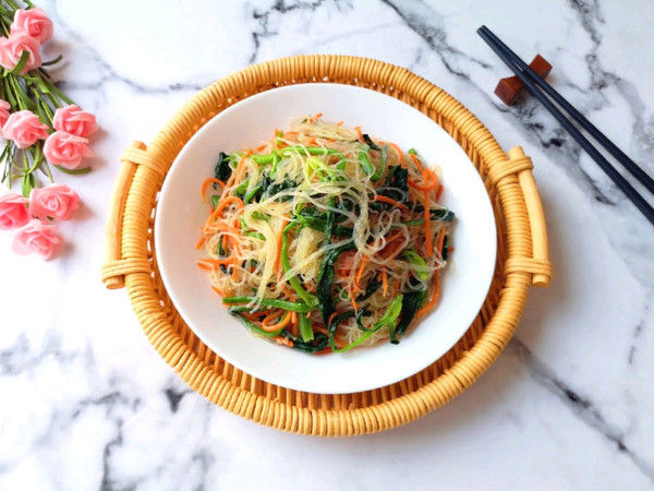 准备好的粉丝、胡萝卜丝和菠菜一起放在盆里。