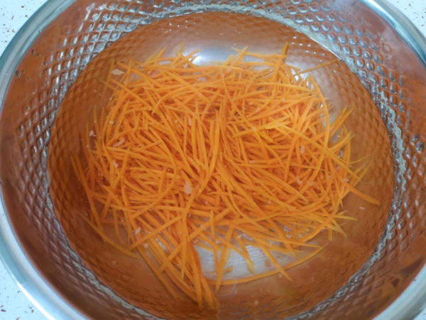 胡萝卜丝放入煮过粉丝的热水里面烫一分钟,捞出过凉水,之后控一下水分备用。