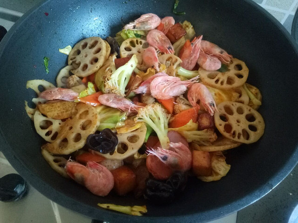 家里没有鲜虾了,所以我偷懒放了北极甜虾,如果是鲜虾,先挑去虾线炒熟后再放蔬菜类即可。尝尝味道,如果火锅底料比较淡,可以适量加一点盐。