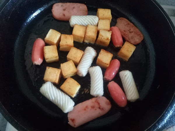 再把小香肠、鱼豆腐、火腿片等煎熟。