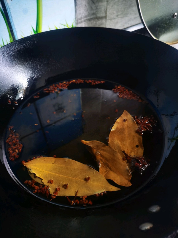 热锅上油,我炸了花椒八角与香叶,味出来后捞掉