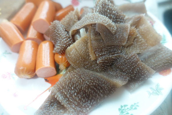 配菜3:毛肚洗净切片,脆皮肠顶端切十字