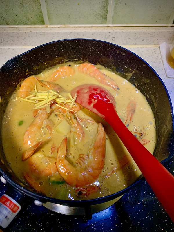 小火慢煮 使咖喱块完全融化 锅中椰浆咖喱酱开始浓稠 并且冒小泡泡