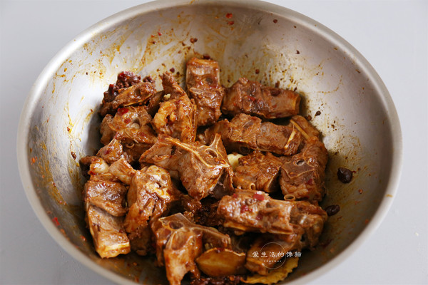 倒入羊蝎子,大火翻炒均匀,看到羊蝎子沾满酱汁后