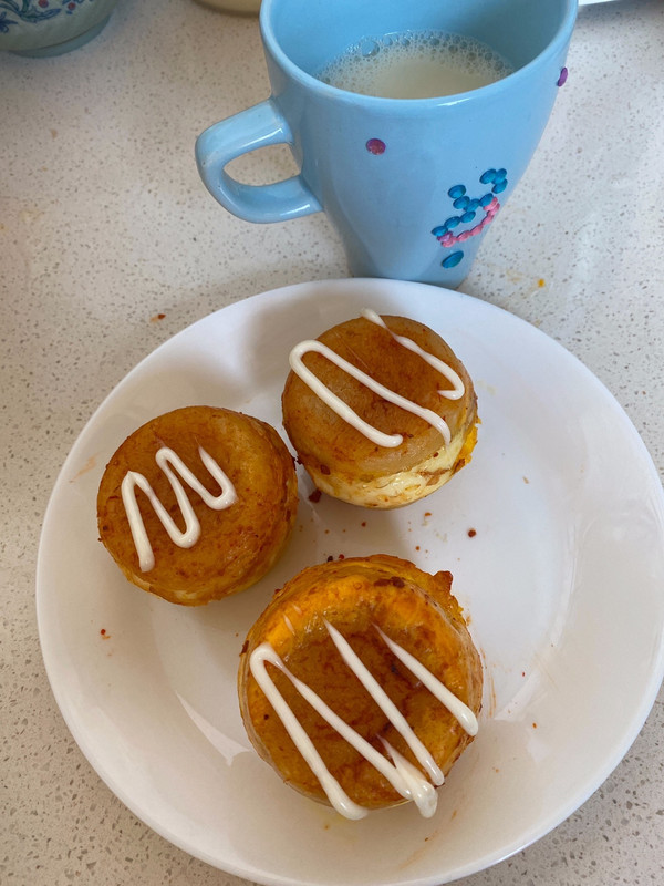 烤制8分钟左右取出,将肉馅鸡蛋放到面糊的一边,然后在原来放鸡蛋的烤盘里再倒入一层面糊,放入烤箱8分钟
