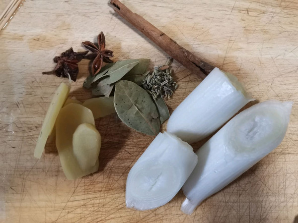 接着再准备一些 姜片  葱白段  香叶  茴香  大料  桂皮