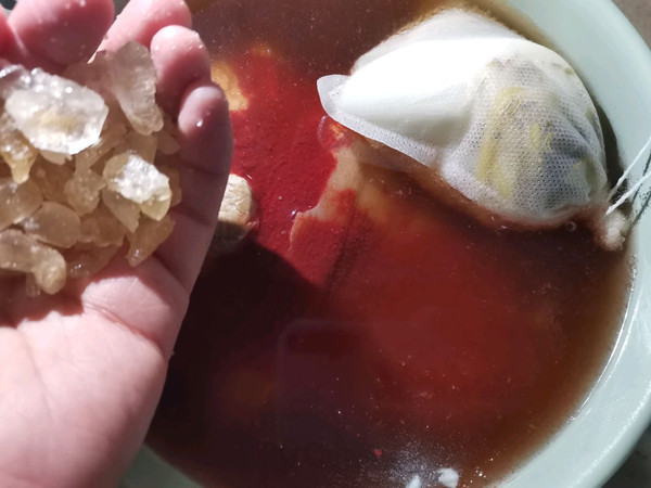 最后加入适量口味的盐增加咸度  然后再次盖上盖子卤制至少3个半小时(猪肘卤制的时间越长就越好吃  你要是觉得3个半小时不够可以再多卤制一段时间)